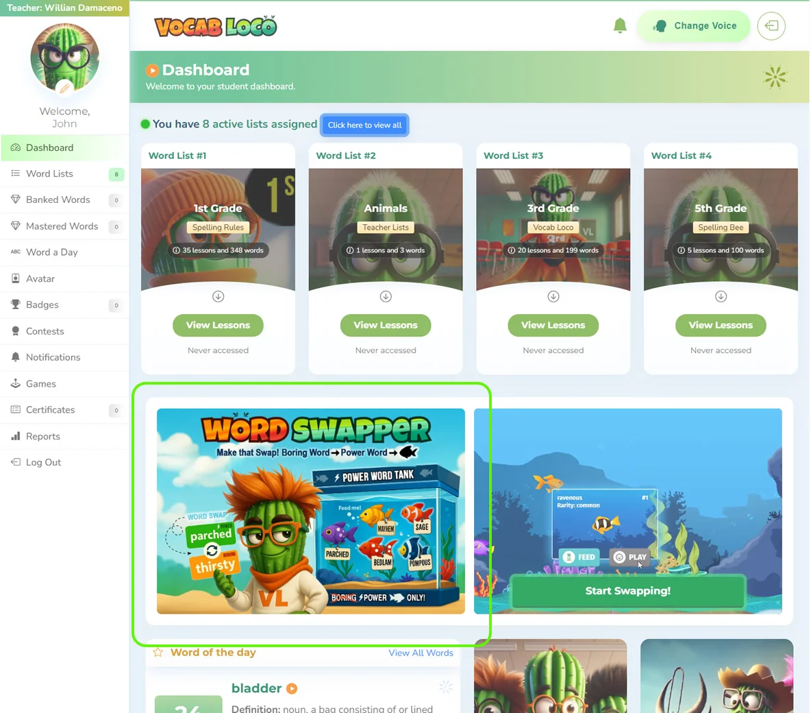 Where to Access: You can find Word Swapper right on your Student Dashboard under Word Lists—just scroll down and click Start Swapping!.