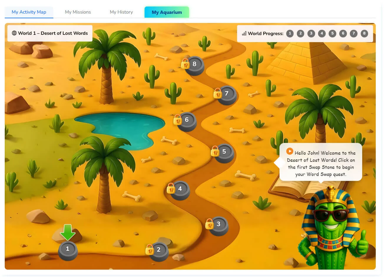 When students complete all three missions, they earn a digital fish named after their Power Word—an unforgettable trophy tied to their learning journey.